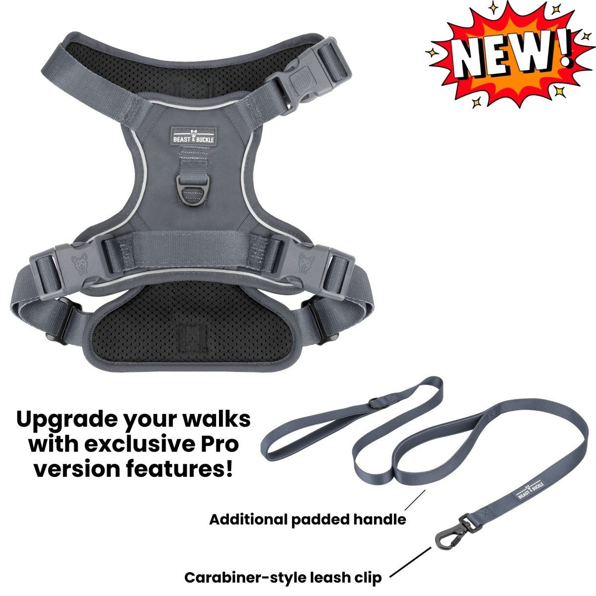 Pro leash version features - Carabiner-style leash clip and additional padded handle in the middle of the leash strap for two-hand walking methods