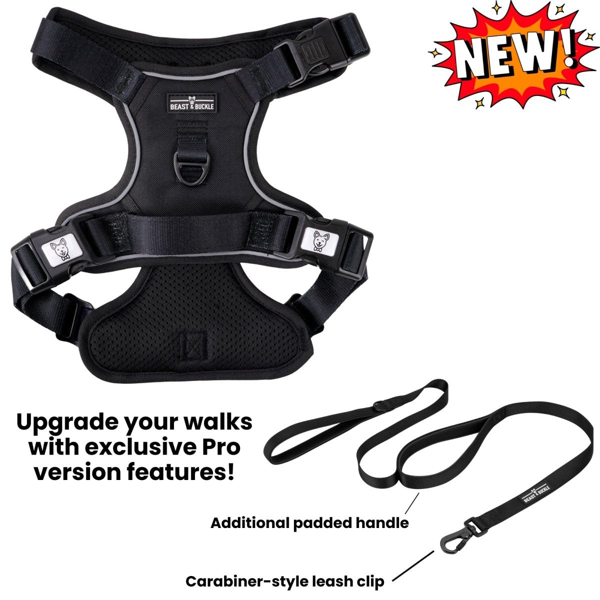 Pro leash version features - Carabiner-style leash clip and additional padded handle in the middle of the leash strap for two-hand walking methods