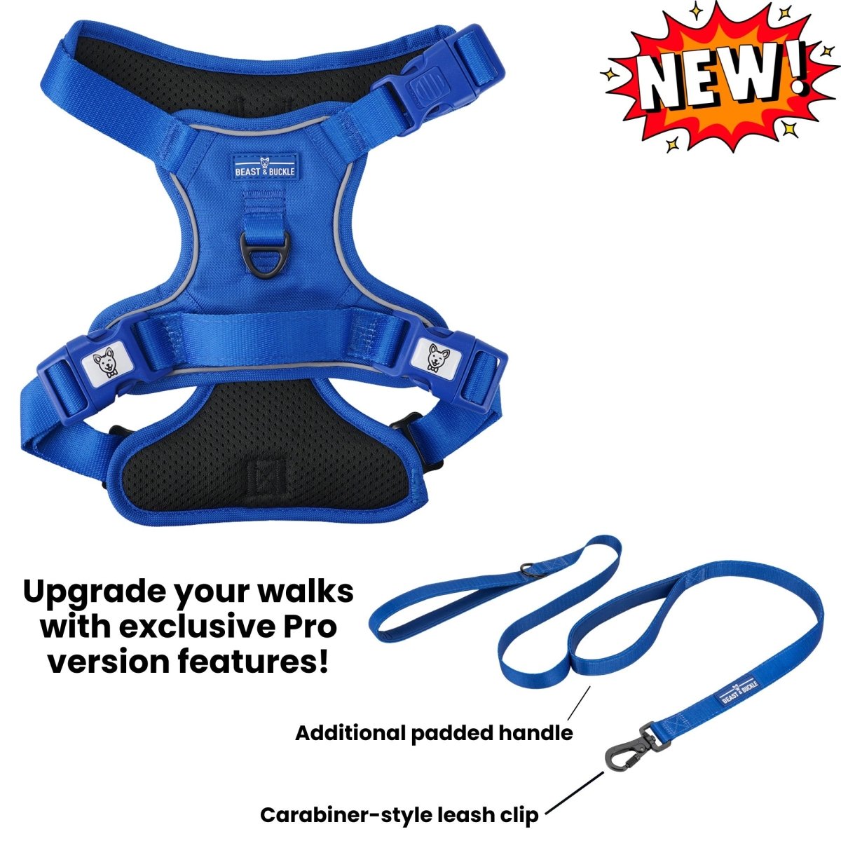 Pro leash version features - Carabiner-style leash clip and additional padded handle in the middle of the leash strap for two-hand walking methods