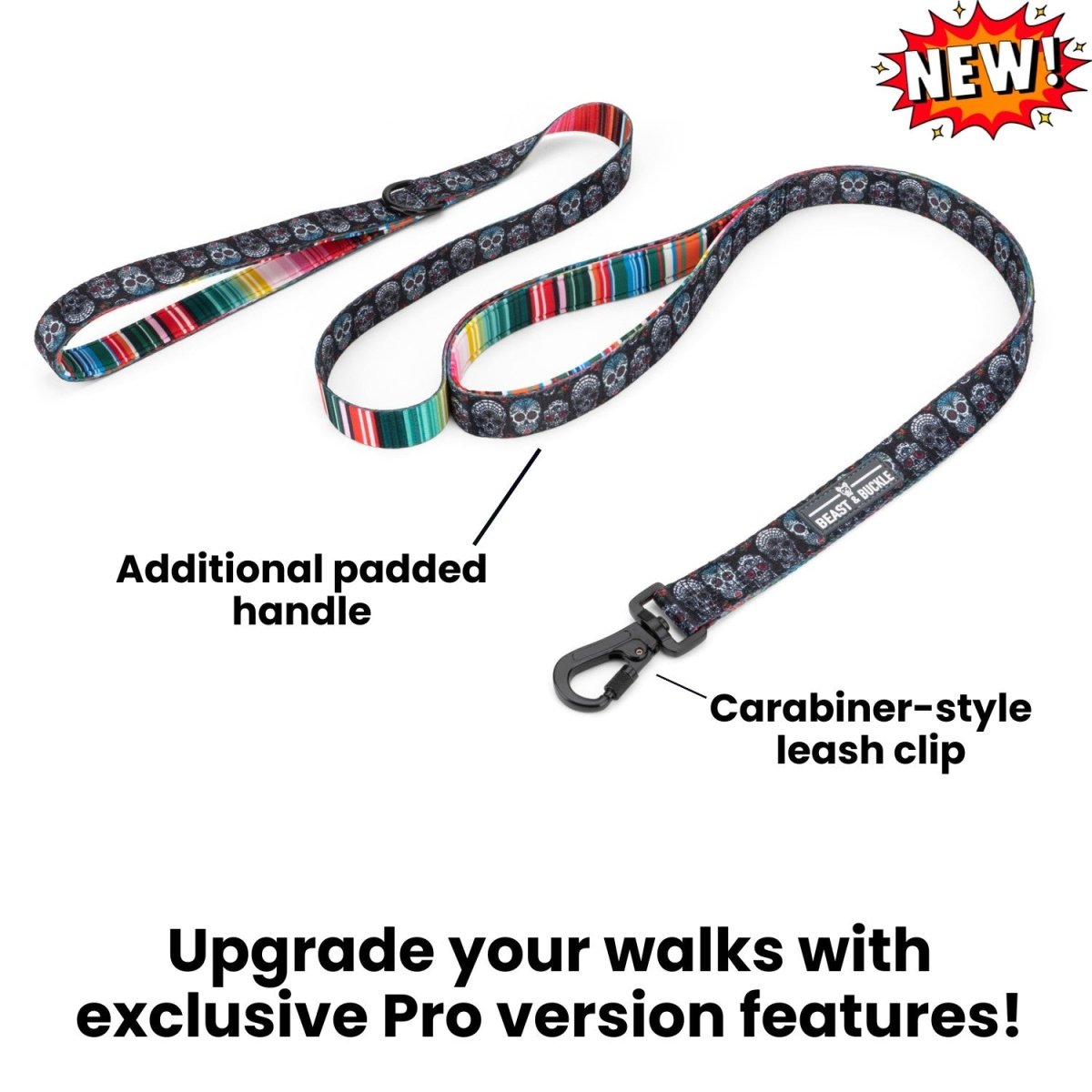 Pro version features - Carabiner-style leash clip and additional padded handle in the middle of the leash strap for two-hand walking methods