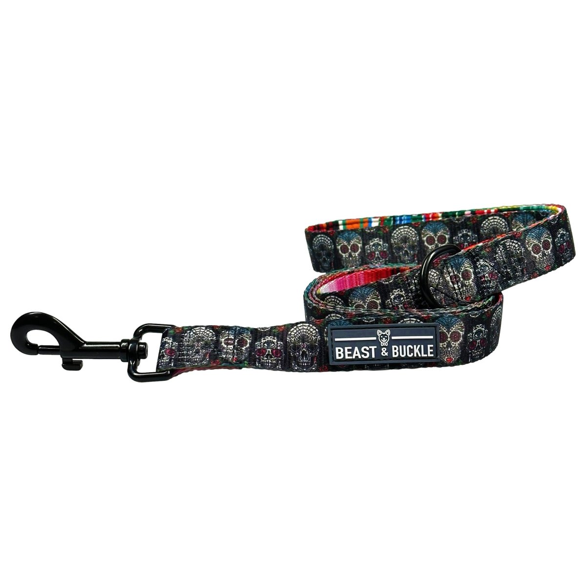 Designed to match our Sugar Skulls dog harness, our leash sits comfortably in your human's hand and features an extra D-ring for your poop bag carrier.